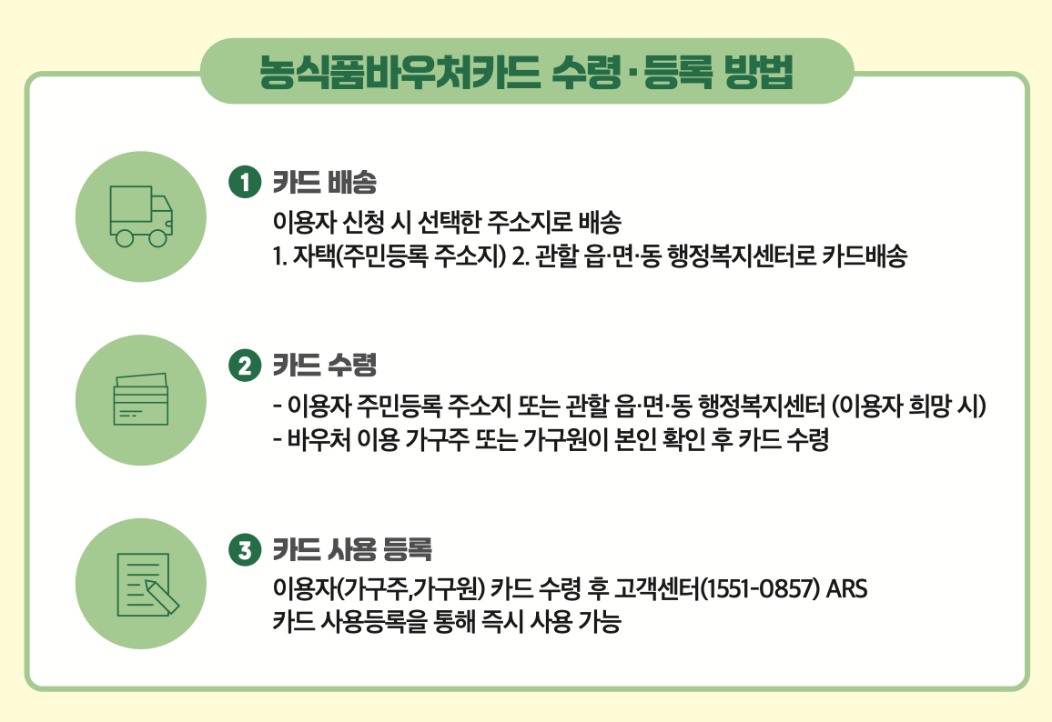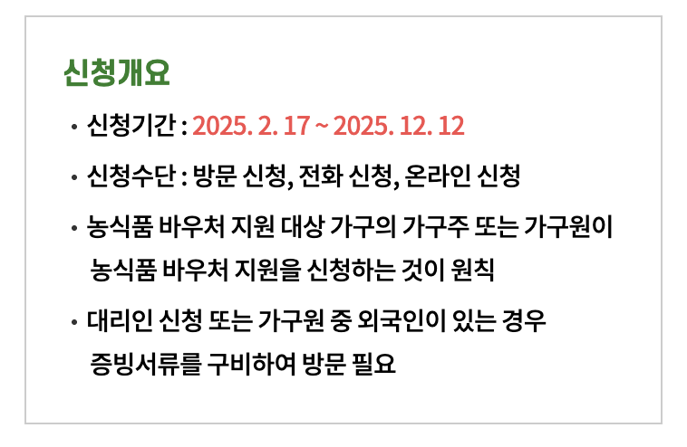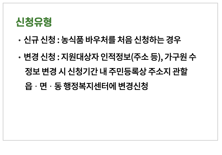 - 신청 완료: 서류 심사를 거쳐 승인되면, 신청자는 농식품 바우처를 지급받게 됩니다.