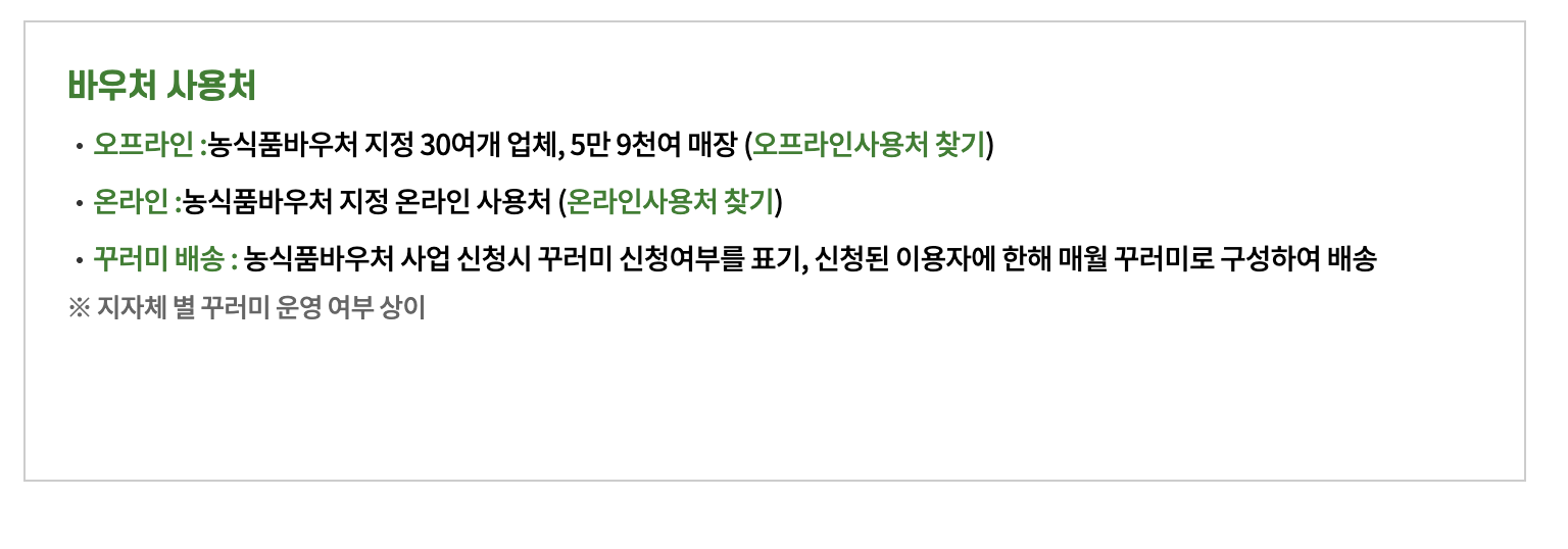 - 농산물 직거래 장터: 농산물 직거래 장터나 로컬 마켓에서 바우처를 사용하여 신선한 농산물을 구매할 수 있습니다.