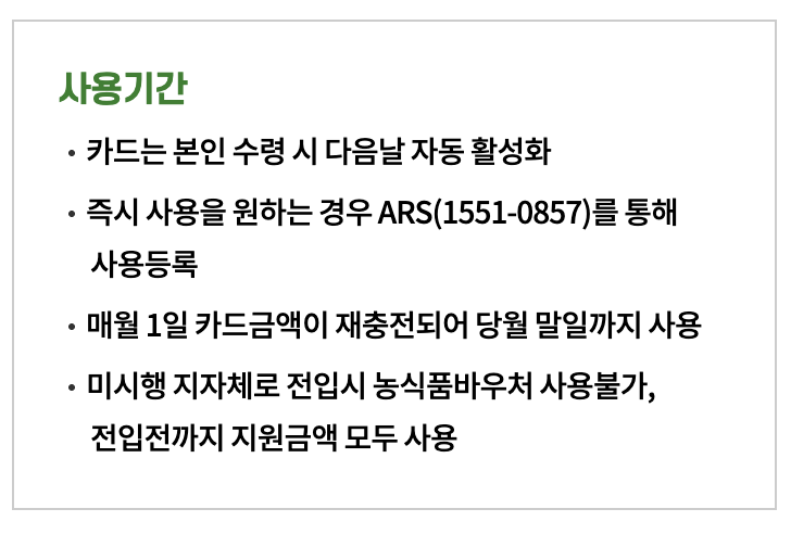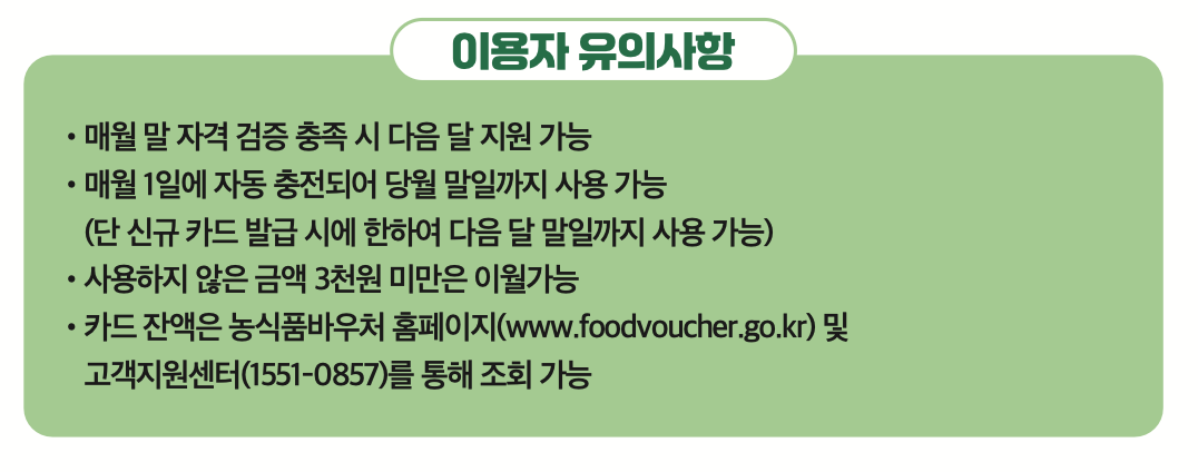 - 유효기간: 농식품 바우처에는 사용 기한이 있습니다. 기한 내에 사용하지 않으면 바우처가 소멸될 수 있으므로 기한을 확인하고 사용을 권장합니다.