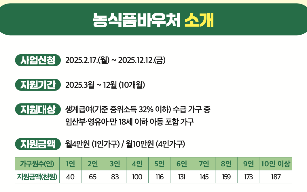 - 기초생활수급자: 기초생활수급자 가구는 기본적으로 농식품 바우처 신청 대상에 포함됩니다.